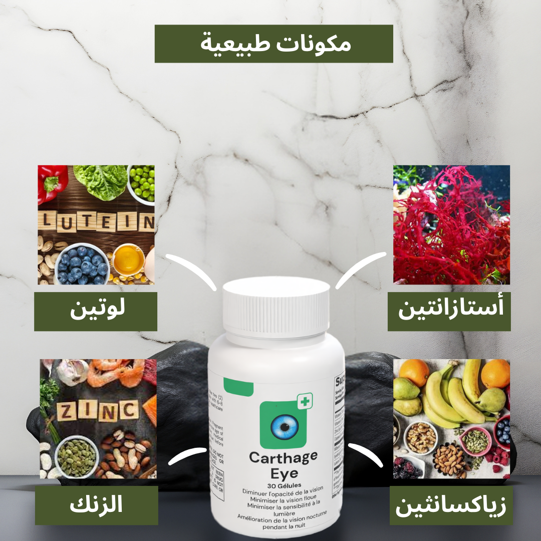 كبسولات عيون قرطاج مصممة خصيصًا لدعم صحة العين وتحسين جودة الرؤية. تحتوي تركيبتها على مزيج من الفيتامينات والمستخلصات الطبيعية التي تساعد في تقليل إجهاد العيون الناتج عن التعرض المطول للشاشات والعوامل البيئية الضارة. تعمل المكونات النشطة على دعم صحة الشبكية، تعزيز الرؤية الليلية، والمساهمة في حماية العين من التأثيرات السلبية للأشعة الزرقاء.